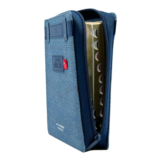 Biblia Reina Valera 1960 tamaño portátil Letra Grande 11 puntos cubierta tela jean con cinturón piel azul. Con cierre e índice. Colección Jean.