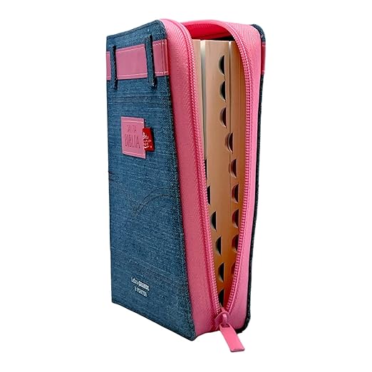 Biblia Reina Valera 1960 tamaño portátil Letra Grande 11 puntos cubierta tela jean con cinturón piel rosa. Con cierre e índice. Colección Jean.