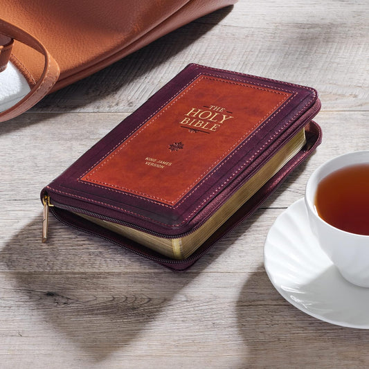 KJV Holy Bible, Compact Faux Leather Red Letter Edition - Ribbon Marker, King James Version, Burgundy/Saddle Tan, Zipper Closure (KJV Compact Bible)