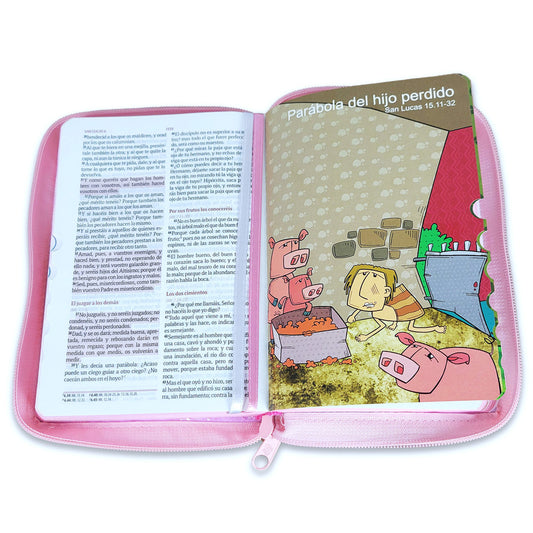 Biblia para Niñas Letra Grande Interactiva con Cierre RV1960 tela rosa
