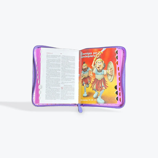 Biblia Para Niñas Mi Gran Viaje RVR, 1960 piel imitacion Morado LILA Con Indice Y Cierre 8.5 puntos