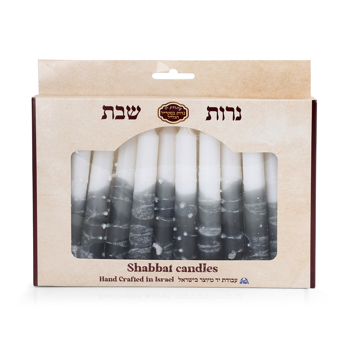 This beautiful set contains six pairs of stunningly gorgeous Shabbat candles. Each was hand dipped skillfully in wonderful shades of black and white that complement each other. The finishing touch is a pouring of white crystalized lines and drops. The perfect gift for every taste.