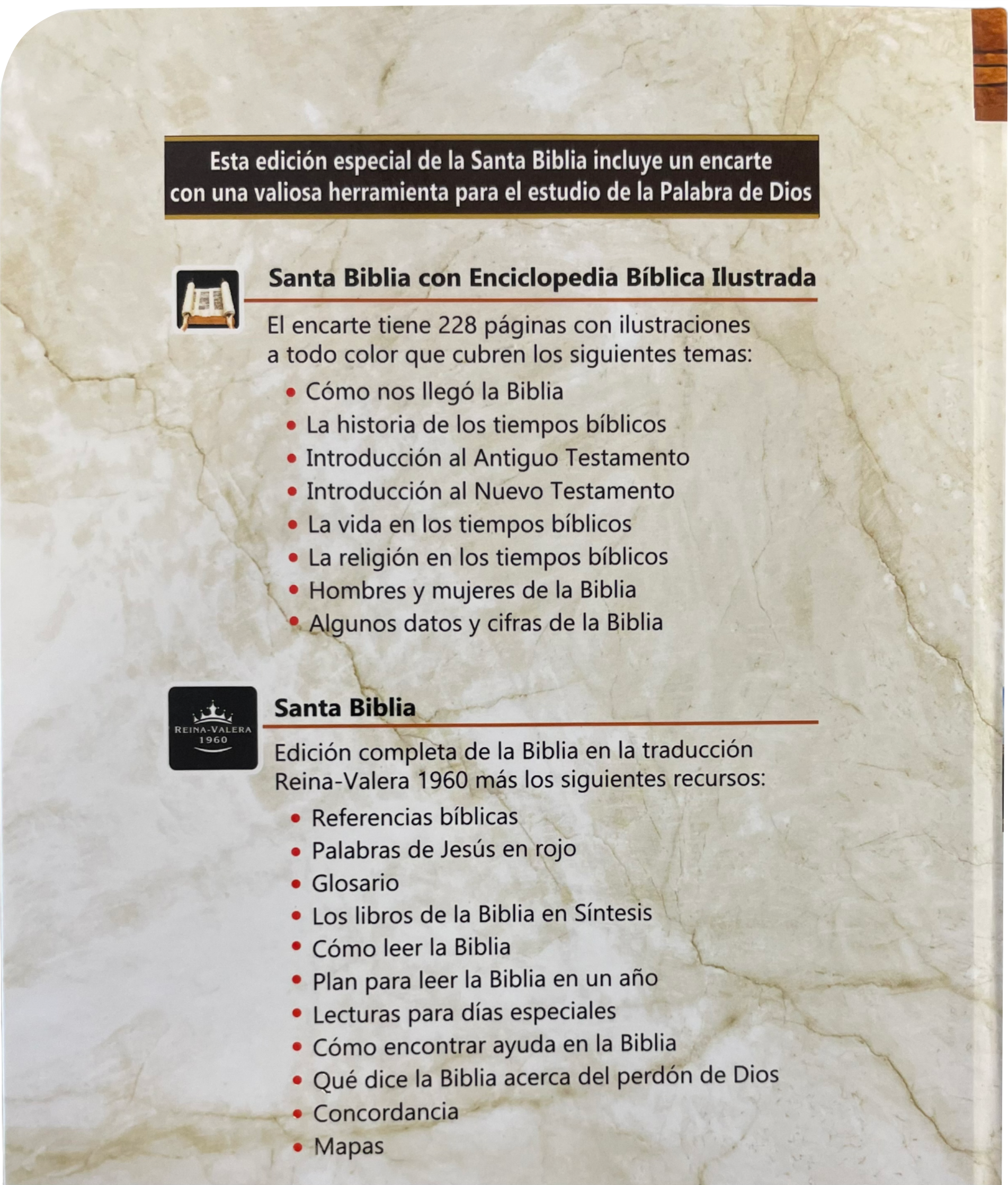 La Biblia con enciclopedia le ayudará a estudiar las Escrituras y entender el trasfondo cultural de los tiempos bíblicos. El encarte tiene 228 paginas con ilustraciones a todo color que cubren los siguientes temas: