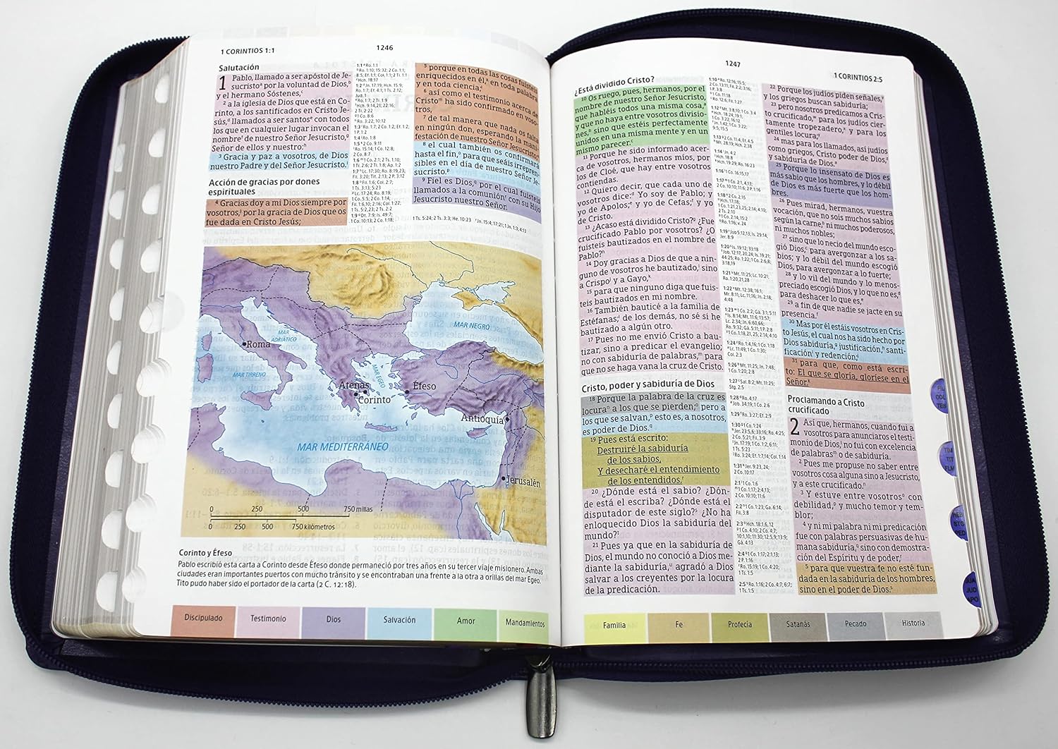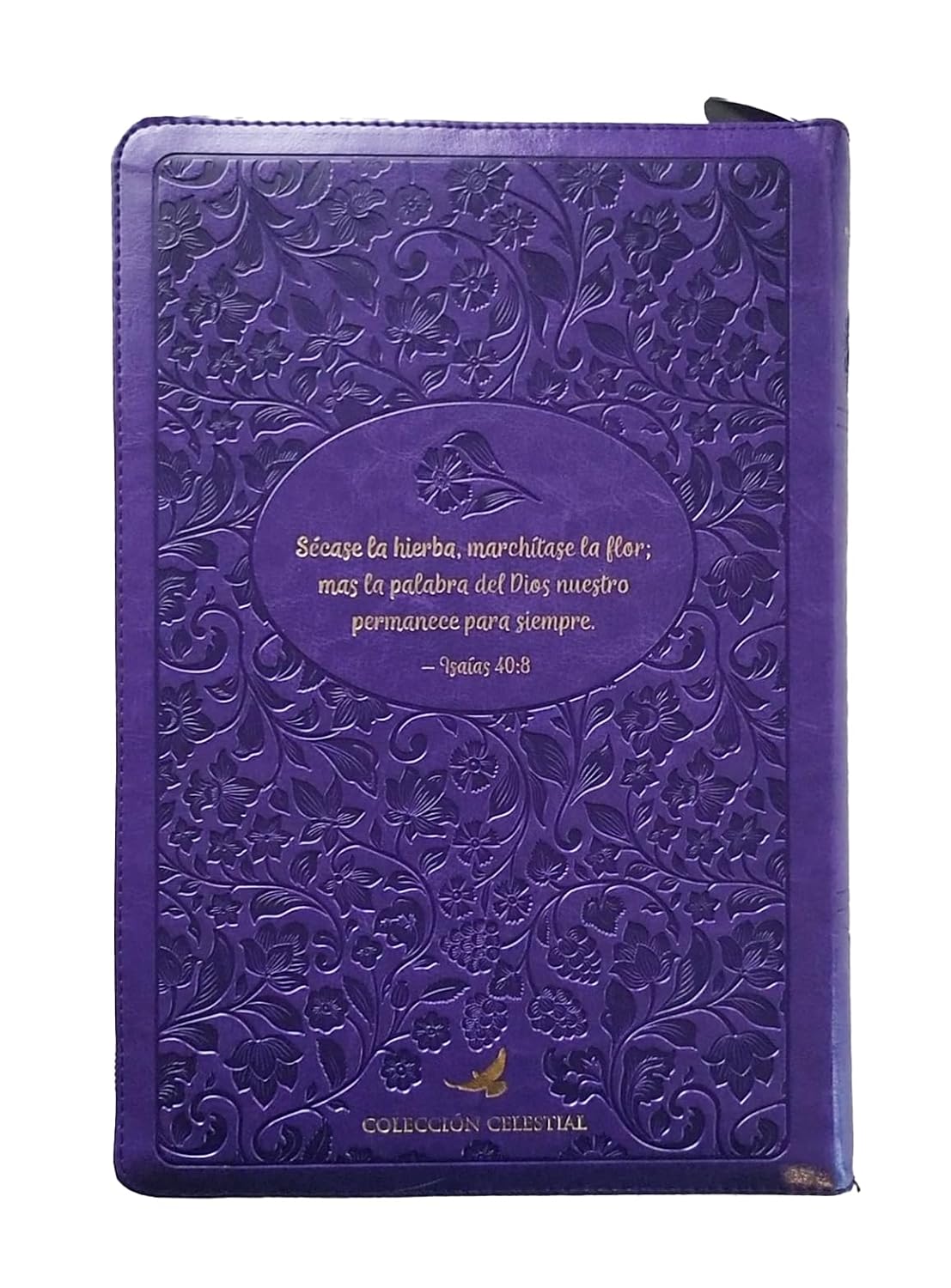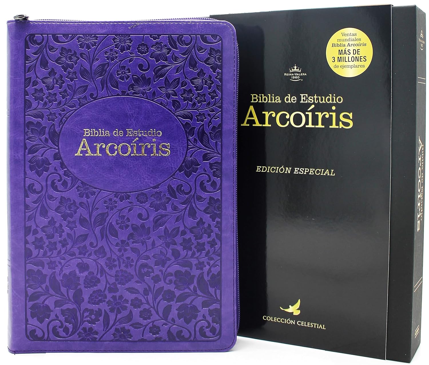 La Biblia de Estudio Arco Iris RVR 1960 Edicion Coleccion Celestial viene en su nuevo diseno de foro hecho de semil piel en color caoba y esquina de color cobre con cierre y estuche de proteccion disenado para ayudar a proteger la Biblia. Tambien esta hecha usando los mejores materiales posibles incluyendo el papel pegado a la Bibla y al foro que esta compuesto con una capa especial para que sea mas resistente al uso de la Biblia.
