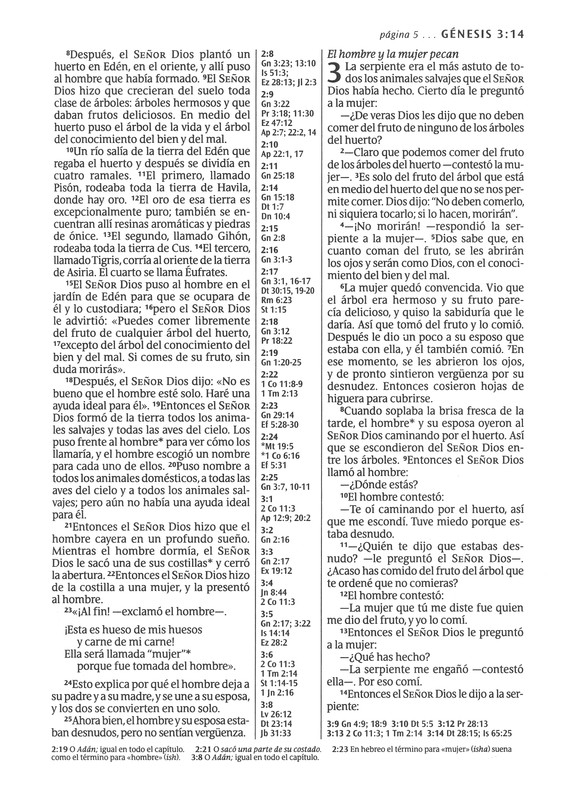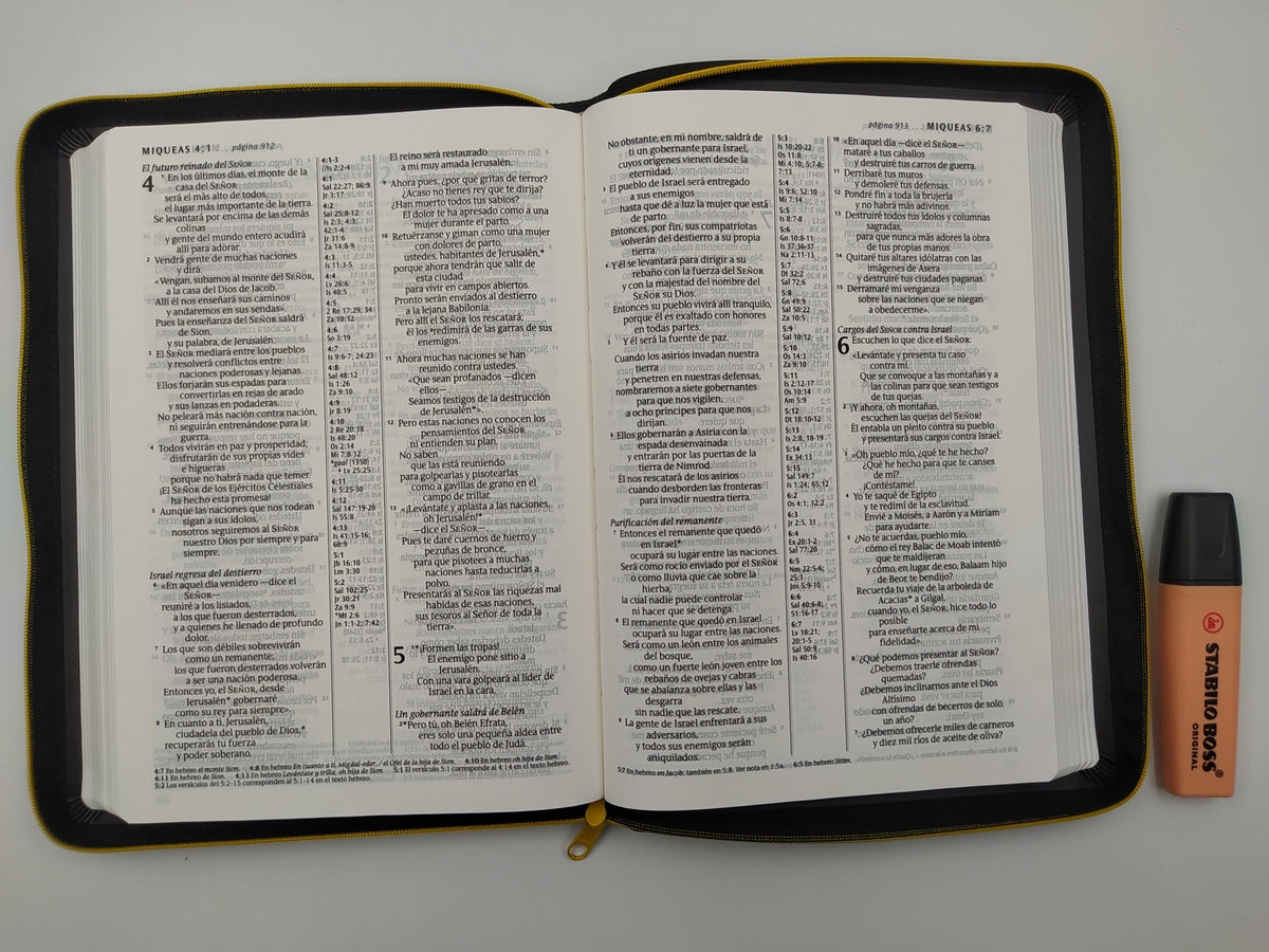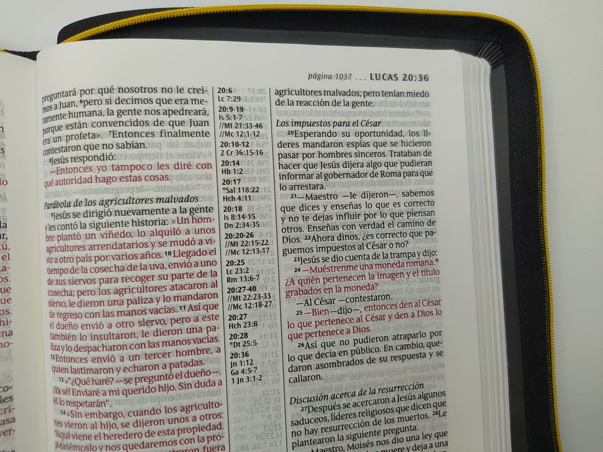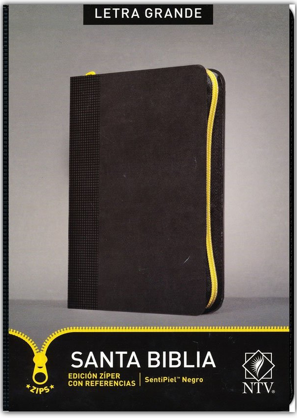 La Edición zíper letra grande con referencias incluye introducciones a cada libro, extensas referencias cruzadas en la columna central, el sistema de estudio de palabras NTV con diccionario e índice en hebreo y griego, una concordancia y tres mapas a todo color. Esta edición de letra grande muestra las palabras de Cristo en rojo, e incluye una página de presentación además de un cierre de cremallera alrededor de toda la cubierta.