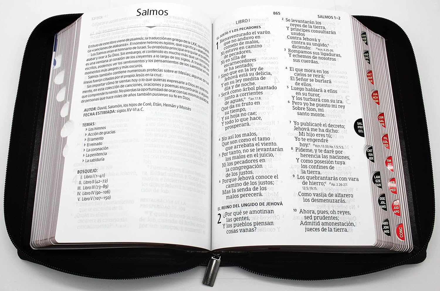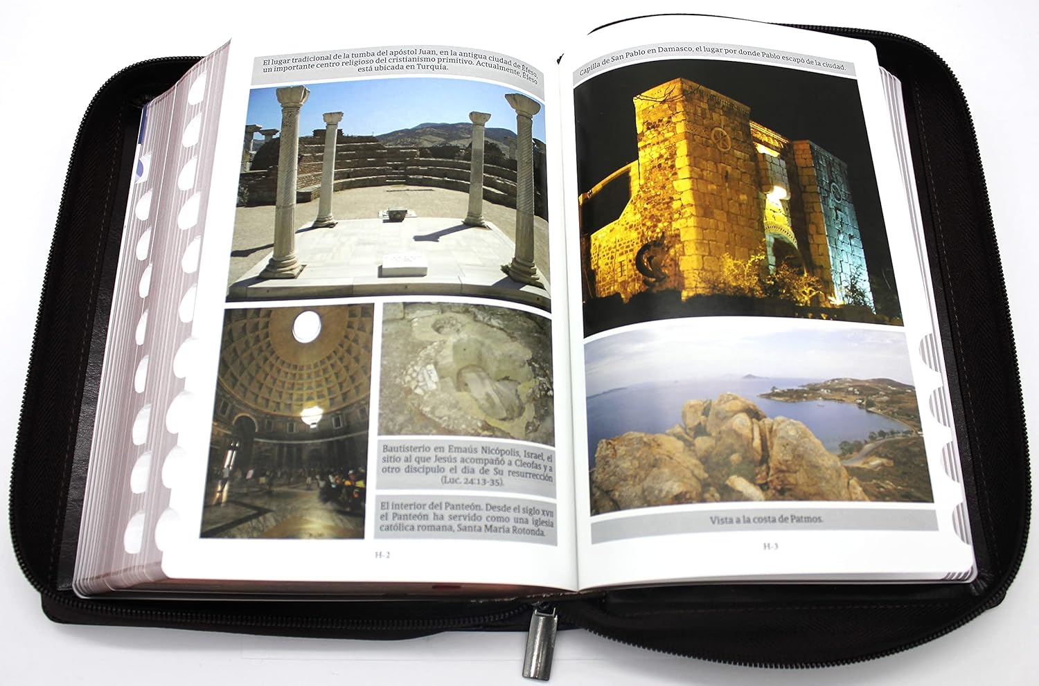Viene en una letra y fuente Gigante de 14 puntos que ayuda a todo lector leer la Biblia mas facilmente sin cansar los ojos. Contiene fotos y ilustraciones para ayudar a ver y conocer un poco mas los lugares y eventos mencionados en la Biblia como el campo donde David enfrento y mato a Goliath, como se vestia el Sacerdote, el Monte de los Olivos , el Rio Jordan y muchos lugares mas. Ahora incluye exclusivamente Los Fundamentos de Cristianismo Genuino.