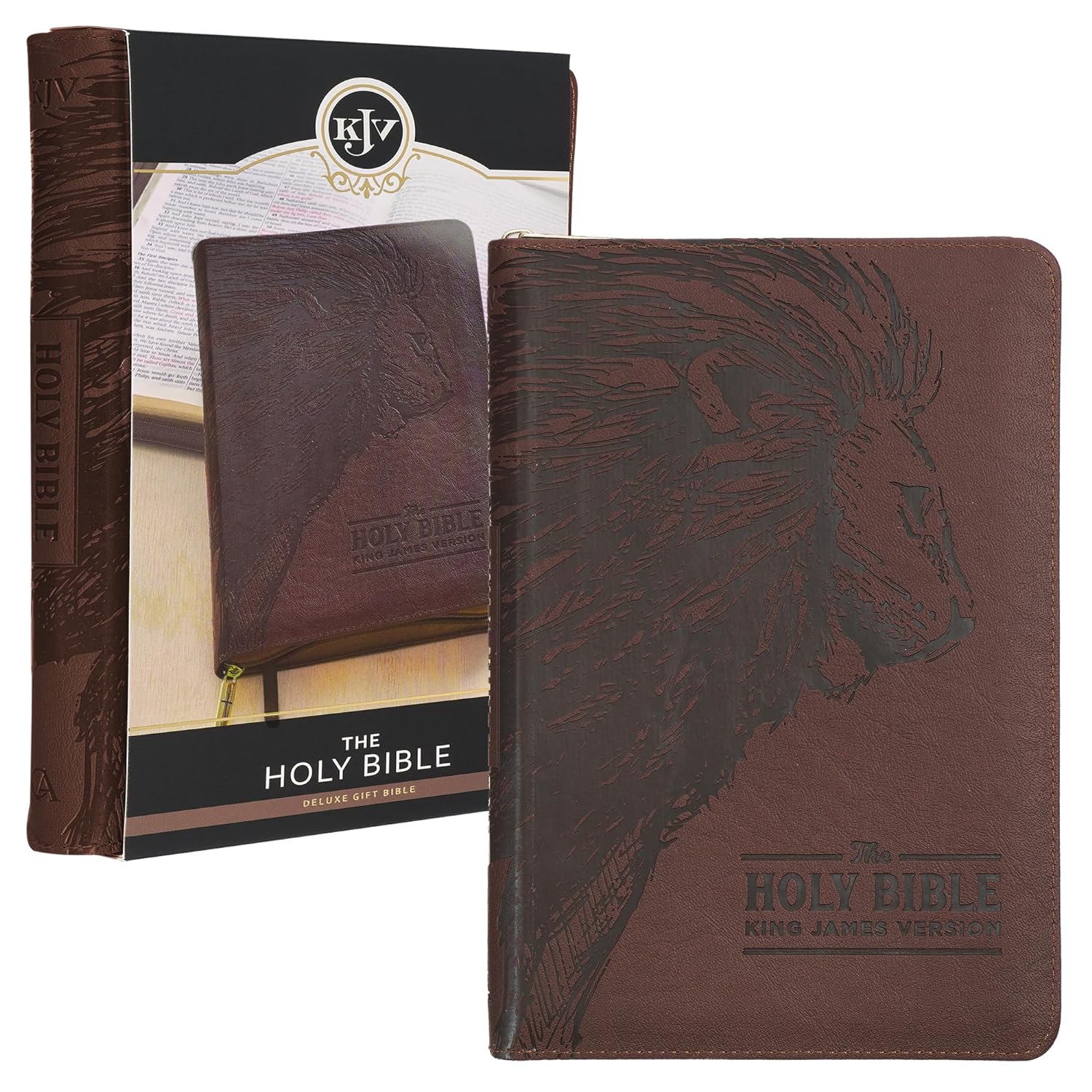 The espresso-brown faux leather cover of the gift Bible showcases the heat-debossed silhouette of a regal lion, conjuring a sense of reality and strength. The title and version reference of the Bible are tastefully heat-debossed in the lower right-hand corner.