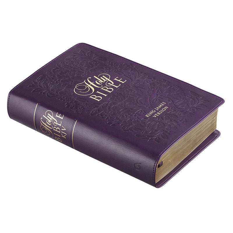 This regal King James Version Bible is wrapped in purple faux leather that is heat debossed with a subtle floral motif. The title and version reference are gold foiled and placed inside two small vignettes. The back cover features a heat debossed flowering branch while the spine features the same title and version reference-also in gold foil. The gilt-edged pages perfectly complement the gold foiled title. Purple topstitching around the edges of the cover adds subtle support to an already sturdy Bible. Inside you'll find a highly legible 14 point type print, making God's Word accessible to those challenged by their vision. The extra study resources included are eight full-color maps, a handy concordance, a Scripture verse finder organized by theme, cross-referencing, thumb indexing, and a reading plan that will lead you through the entire Bible in one year. An excellent gift to a loved one or an ideal addition to your personal library.