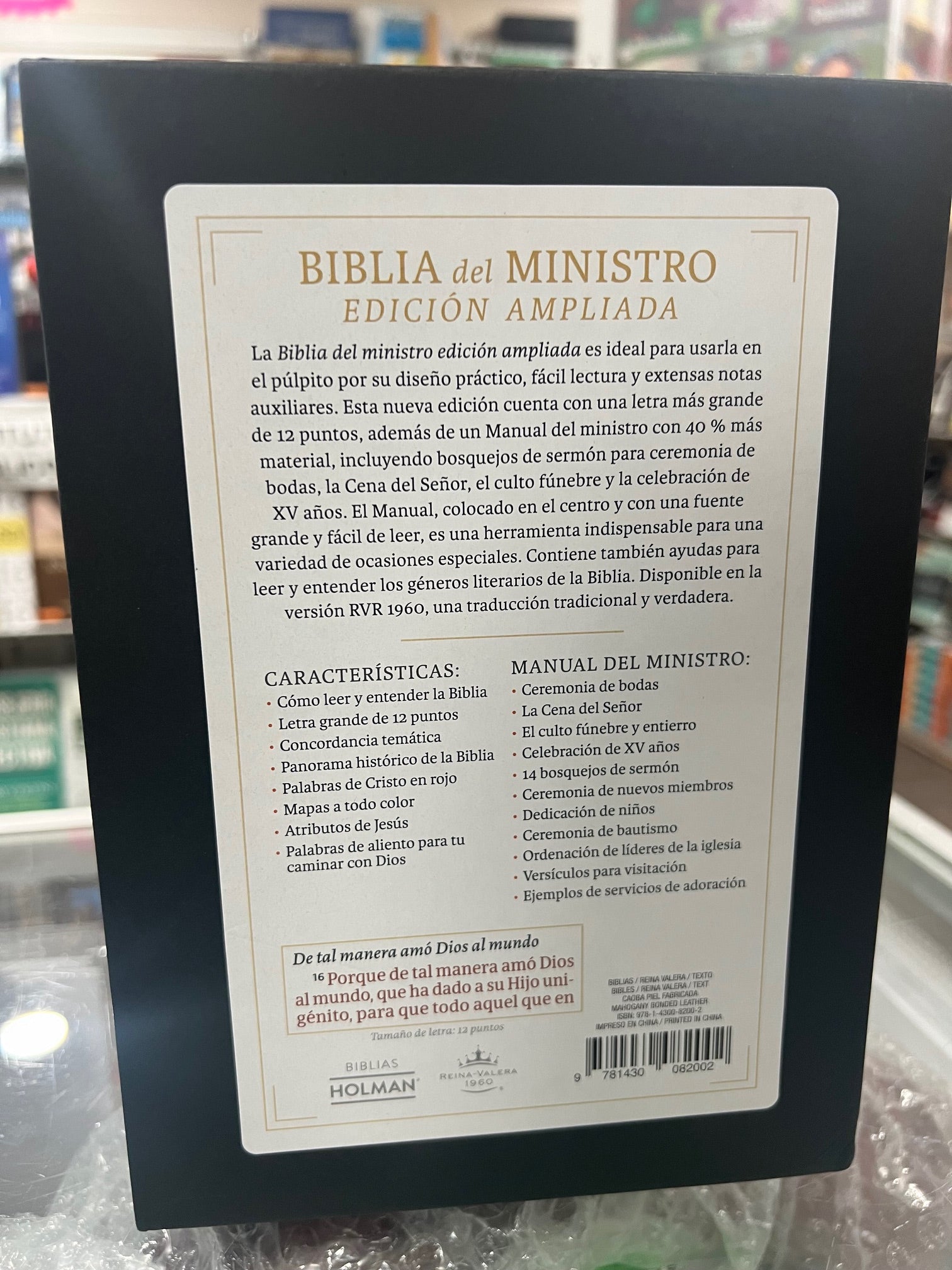 La RVR 1960 Biblia del ministro edición ampliada es ideal para usarla en el púlpito por su diseño práctico, fácil lectura y extensas notas auxiliares. Esta nueva edición cuenta con una letra más grande de 12 puntos, además de un Manual del ministro con 40 % más material, incluyendo bosquejos de sermón para ceremonia de bodas, la Cena del Señor, el culto fúnebre y la celebración de XV años. El Manual, colocado en el centro y con una fuente grande y fácil de leer, es una herramienta indispensable para una variedad de ocasiones especiales. Contiene también ayudas para leer y entender los géneros literarios de la Biblia. Disponible en la versión RVR 1960, una traducción tradicional y verdadera.