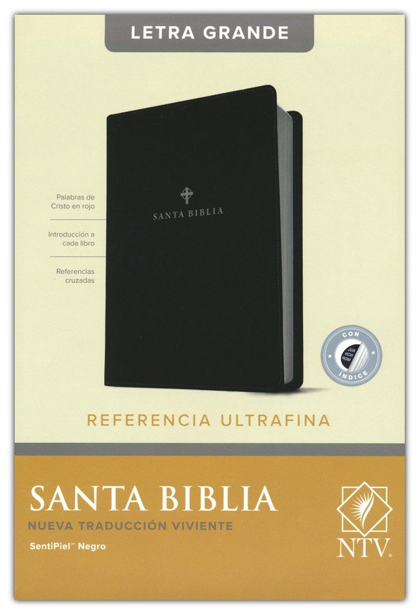 La Edición de referencia ultrafina, letra grande de la NTV ha sido una Biblia muy popular por varios años. Ofrece una experiencia de lectura muy confortable para todos aquellos que prefieren una Biblia de letra grande. Sus características de lujo incluyen el sistema de estudio de palabras NTV con diccionario e índice en hebreo/griego, una concordancia, introducciones a los libros, mapas a todo color, palabras de Cristo en rojo, una cinta marcadora, cantos dorados, un índice de pulgar, y una página de presentación.